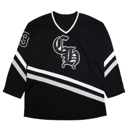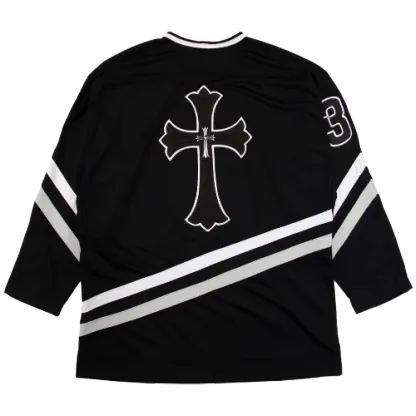 This t-shirt boasts an iconic hockey jersey silhouette, complete with bold stripes and a relaxed fit that enhances its sporty aesthetic. The genuine leather patch prominently displays the Chrome Hearts logo, offering a luxurious contrast to the jersey’s traditional elements. The combination of these design features creates a garment that is both stylish and distinctive.