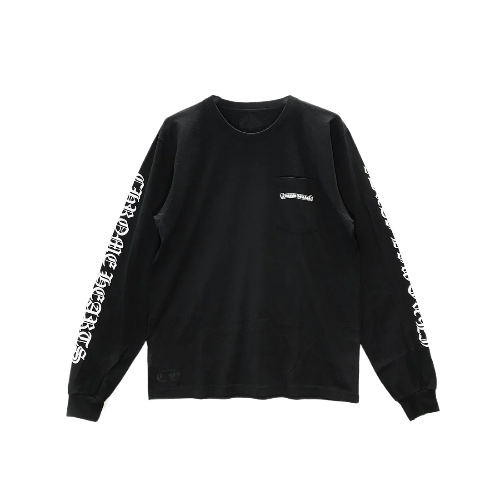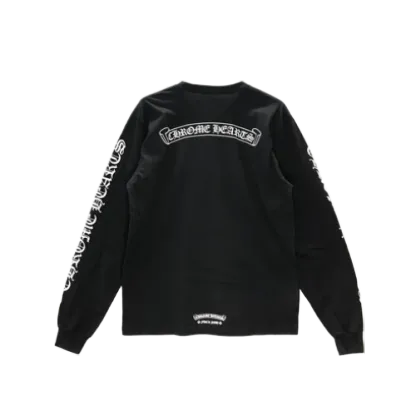 The Script Scroll Logo Long Sleeve T-Shirt by Chrome Hearts is a striking blend of intricate design and timeless style. Featuring the brand’s iconic script scroll logo running down the sleeves, this shirt embodies Chrome Hearts’ commitment to detail and quality craftsmanship. Made from soft, premium cotton, it offers a comfortable fit that’s perfect for all-day wear, while the classic black color ensures versatility in styling.